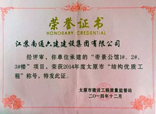2008年度響應太原市委市政府、太原城市建設委員會(huì )參加了四川抗震救災、援川建房,山西省勞動(dòng)競賽委員會(huì )頒發(fā)的“集體一等功”。2011年到2016年連6年榮獲江蘇省住房和城鄉建設廳駐京辦頒發(fā)的“優(yōu)秀進(jìn)晉企業(yè)”。