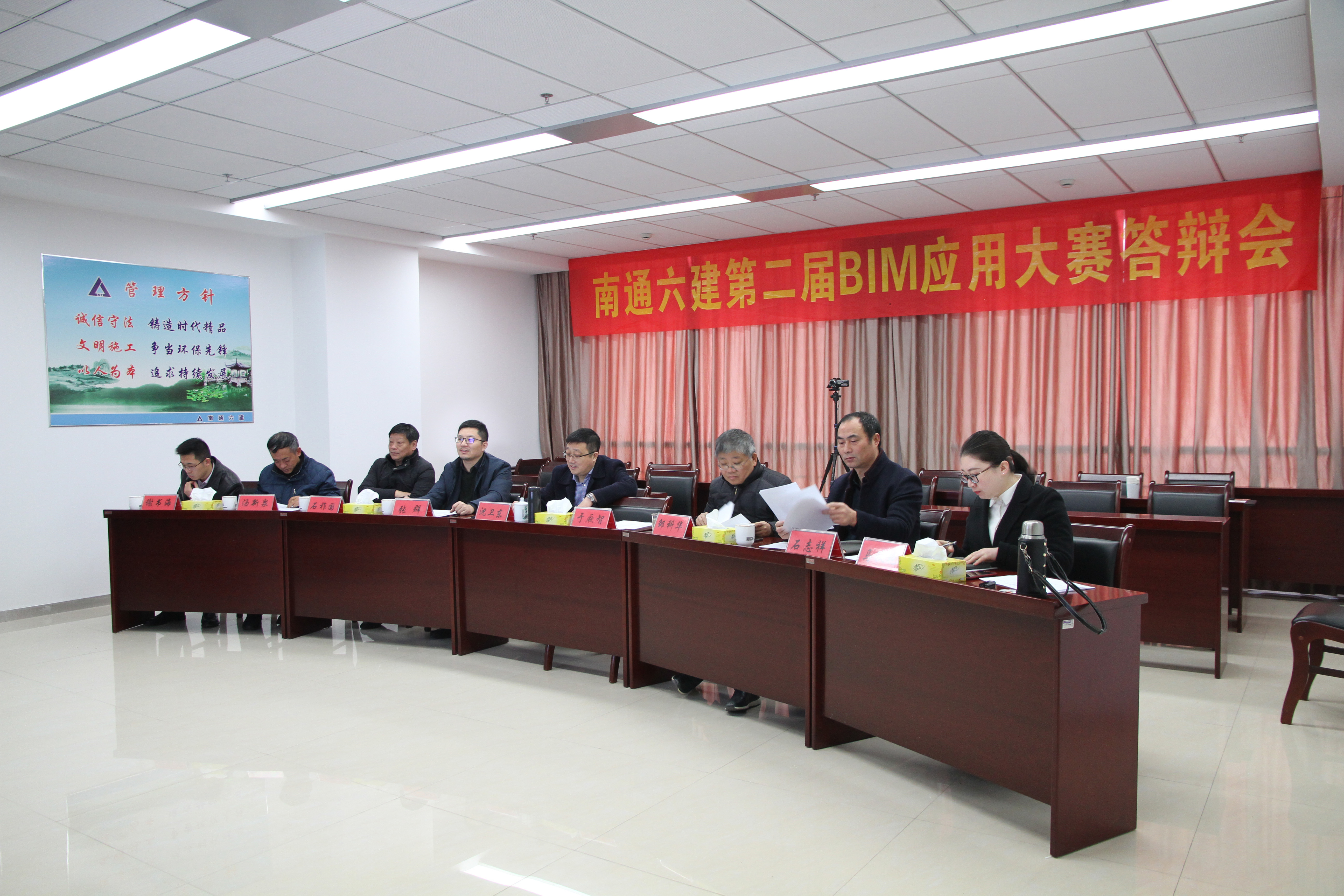 2019年1月24日,南通六建第二屆BIM技術(shù)應用大賽終審答辯會(huì )在集團1405會(huì )議室召開(kāi),南通六建總裁、BIM中心主任沈衛東,董辦主任、經(jīng)營(yíng)管理中心副總監張群,總工程師、工程管理中心副總監鄒科華,安全總監、安全設備部經(jīng)理石祚國,總裁辦主任、BIM中心副主任馬秋艷,技術(shù)雙創(chuàng )中心主任湯新泉,工程管理部經(jīng)理石志祥,商務(wù)管理部經(jīng)理謝書(shū)海作為本次答辯會(huì )評委,11個(gè)入圍作品參加本次答辯會(huì )。